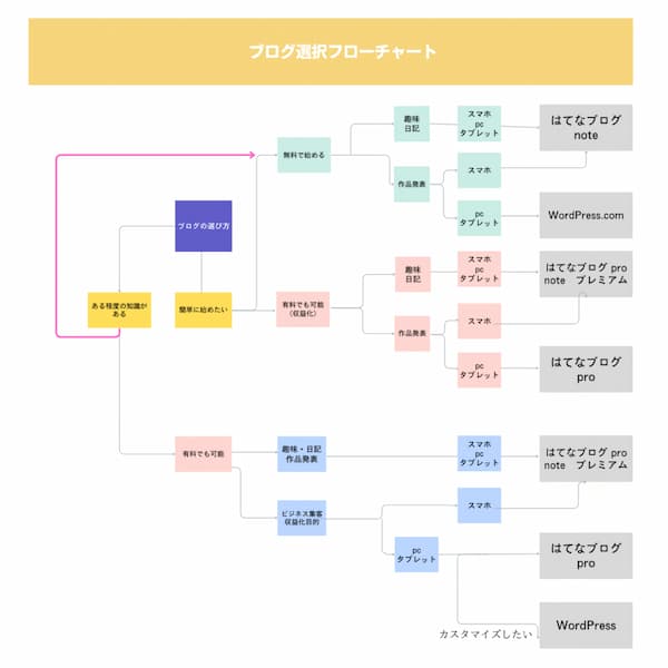 ブログの選び方のブロックからスタートして次々と選択していくとあなたの目的にぴったりのブログサービスが分かります。