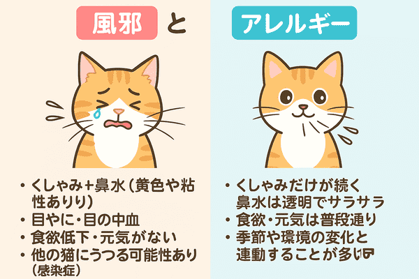 くしゃみと鼻水のみが出るのが特徴で、目には異常が出ません。ただし、ウイルス感染後に細菌が重なって感染すると、粘り気のある鼻水が出て重症化することがあります。