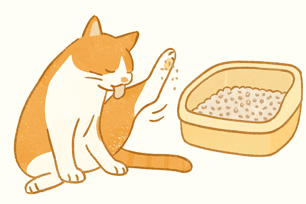 猫砂の成分が毛に付着し、それを舐めることで体内に取り込まれる可能性も。