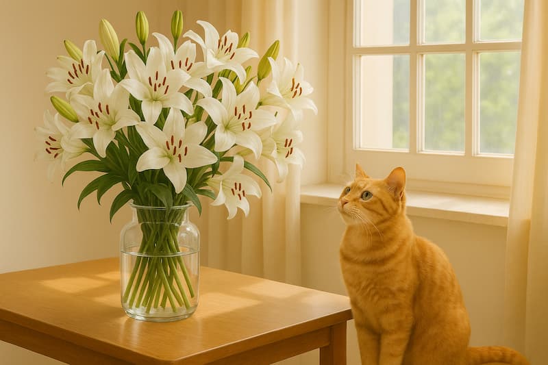 ユリ科の植物は、猫にとって最も危険な植物のひとつです。なぜなら、花、葉、茎、花粉、さらには花瓶の水にまで毒性があるからです。