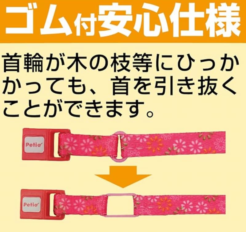 首輪が木の枝等にひっかかっても首を抜くことができるゴム付き安心仕様が気に入って使っています。思わぬ事故に、猫が巻き込まれない安心があります。