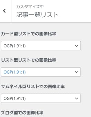 「カスタマイズ」→「記事一覧リスト」→「サムネイル画像の比率設定」をOGP(1.91:1)に変更
