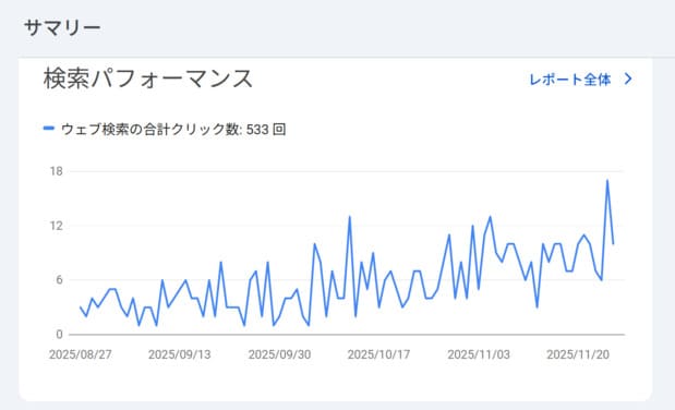 - 検索パフォーマンス: 過去3ヶ月間の合計クリック数(ブログに来てくれた人数)や表示回数(検索結果に出た回数)がグラフで分かります。