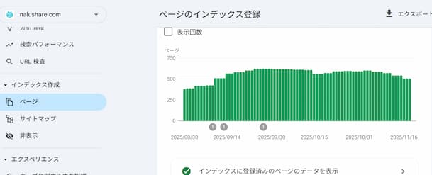 左側メニューの「ページ」をクリックすると、ブログ全体のインデックス状況がグラフで分かります。