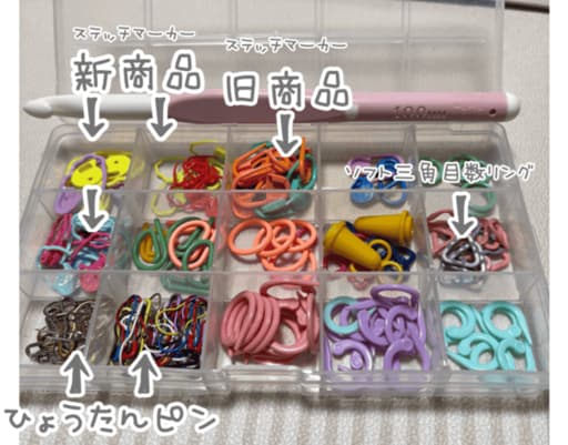 • 編み物初心者で、100均の引っ掛けるだけの段数マーカーを使ってましたが、いつの間にか外れて、目がわからないと言う事が多々ありで… こちらを使用してからは、ロックがかかるので外れる事なく、助かってます。 大きさもいろいろあって使いやすい。 ケース付きで収納もバッチリです。(楽天レビューより)