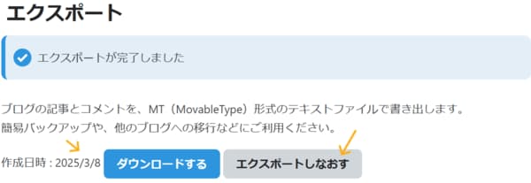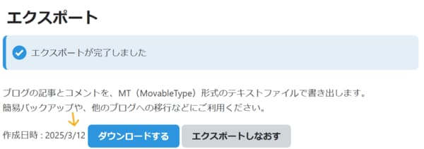 以前にエクスポートをしたことがある場合は、前回の作成日時が表示されていますので、「エクスポートしなおす」をクリックします。