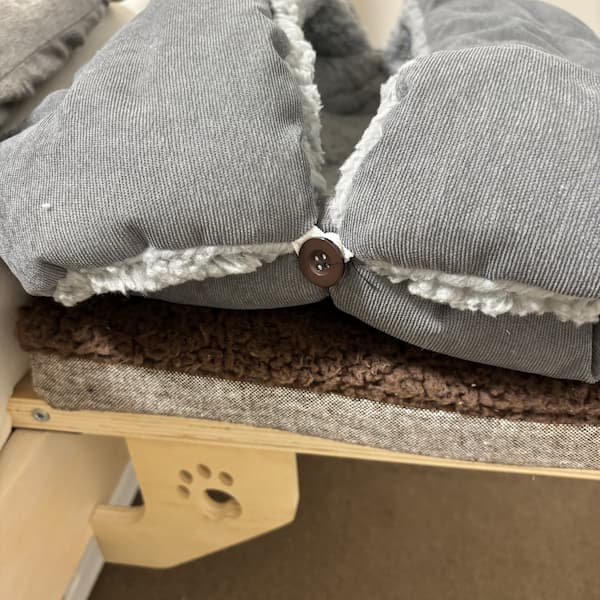 最近では、朝になると窓辺のハンモックにいることが多く、夜は人間のベッドのすぐ横に置いた猫用ベッドで眠るスタイルに落ち着いています。