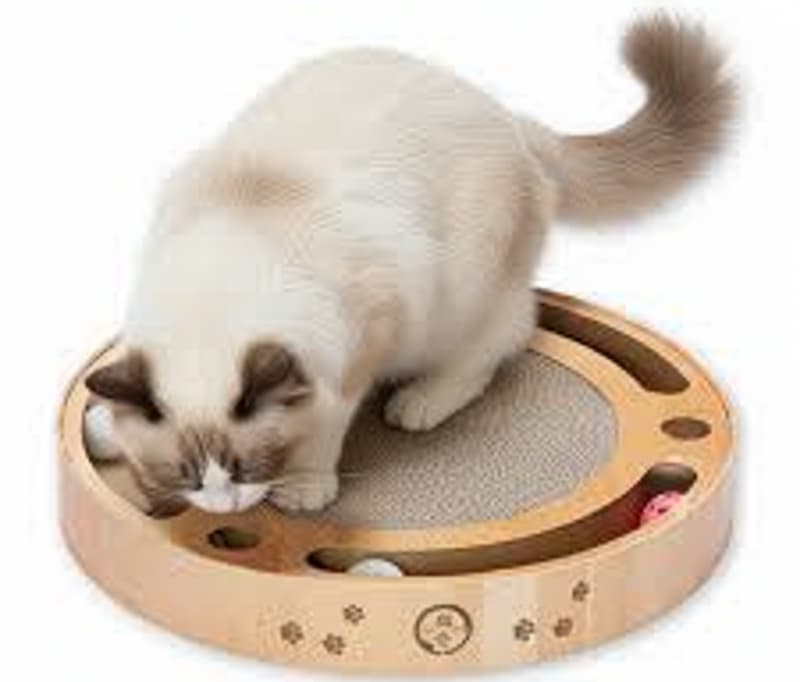 爪とぎとおもちゃが一体化した製品で、縁に沿って配置された2種類のボール(軽量ボールと鈴入りボール)が猫の狩猟本能を刺激します。