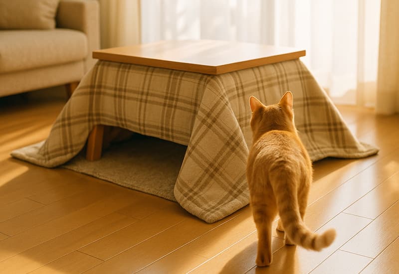 | こたつ | 猫が大好きでよく利用する。 | 酸欠や脱水の危険があるため、必ず隙間を開けておく。 |